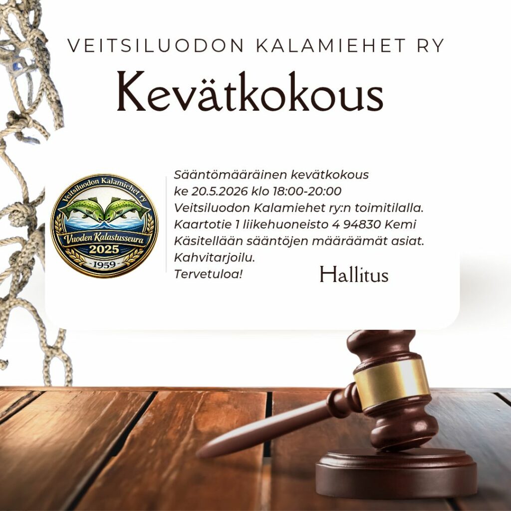 Veitsiluodon Kalamiehet rySääntömääräinen kevätkokousto 24.4.2025 klo 18:00-20:00Veitsiluodon Kalamiehet ry:n toimitilalla.Osoite: Kaartotie 1 Liikehuoneisto 494830 KemiKahvitarjoilu.Tervetuloa!Tiedustelut: Jari Vesaluoma040 837 7992jari.vesaluoma@gmail.com